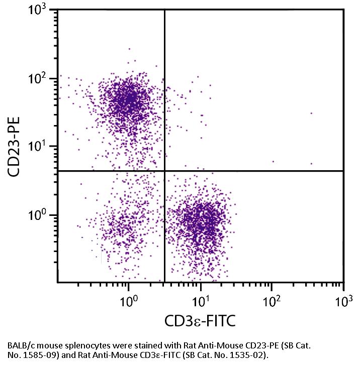 The CD23 antigen is the low affinity IgE Fc receptor, which is a 45-49 kDa protein with 38 and 28 kDa fragments. It is expressed on most mature, conventional B cells (but not on peritoneal CD5+ B cells) and can also be found on the surface of T cells, macrophages and platelets. It is distinct from the high affinity IgE receptors found on basophils and mast cells which mediate allergic reactions. The low affinity receptors are thought to play a role in isotype specific immunoregulation. The regulation of CD23 surface expression appears to be integral with the complex IgE system which involves interactions of cells, cytokines, antibodies and regulatory factors. CD23 has been described as a “membrane bound cytokine, " in that the soluble cleavage products of CD23 are themselves able to act as cytokines in vitro.