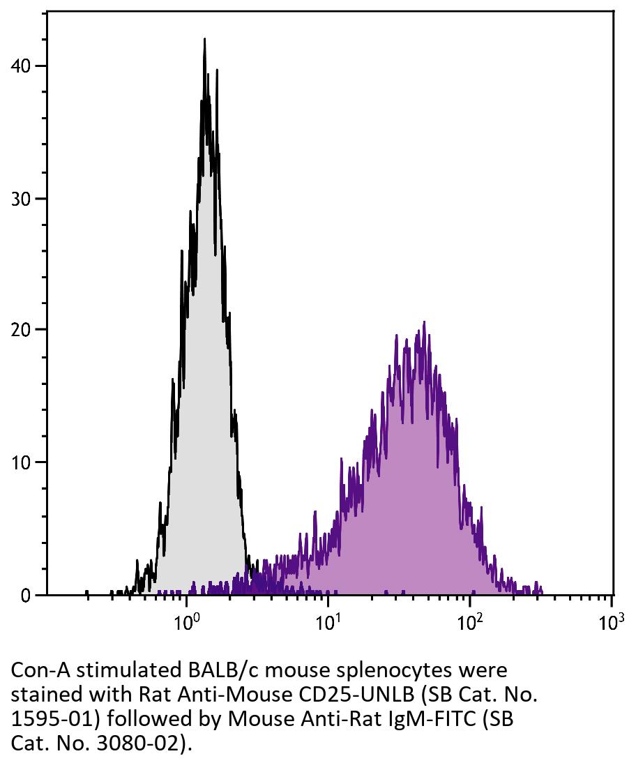 The IL-2 receptor (IL-2R) exists in three alternative forms made up from the individual components of CD25, CD122, and CD132. CD25 represents the low affinity α chain of the IL-2R, a type I transmembrane glycoprotein containing two CCP domains. It is rich in O-linked carbohydrates and has a short cytoplasmic tail. CD25 is expressed on activated T cells, B cells, NK cells, and monocytes of all mouse strains tested. It is transiently expressed at a low level during B cell development in bone marrow on the CD45R/B220low TdT- sIg- pre-B II and CD45R/B220low TdT- sIgM+sIgD- immature B cells, but not on the CD45R/B220low TdT+ sIg- pro-B/pre-B I stage nor on CD45R/B220high TdT- sIgM+sIgD+ mature B cells. CD25 is expressed at a higher level during very early T-cell development in fetal and adult thymus. The 7D4 monoclonal antibody reacts with an epitope between amino acids 125 and 212 that is distinct from that recognized by the monoclonal antibody 3C7 (SB Cat. No. 1600). While the monoclonal antibody 7D4 does not block the binding of IL-2 to CD25, when used in combination with the monoclonal antibody 3C7 it results in higher levels of inhibition of IL-2-driven proliferation than either of these two monoclonal antibodies alone.