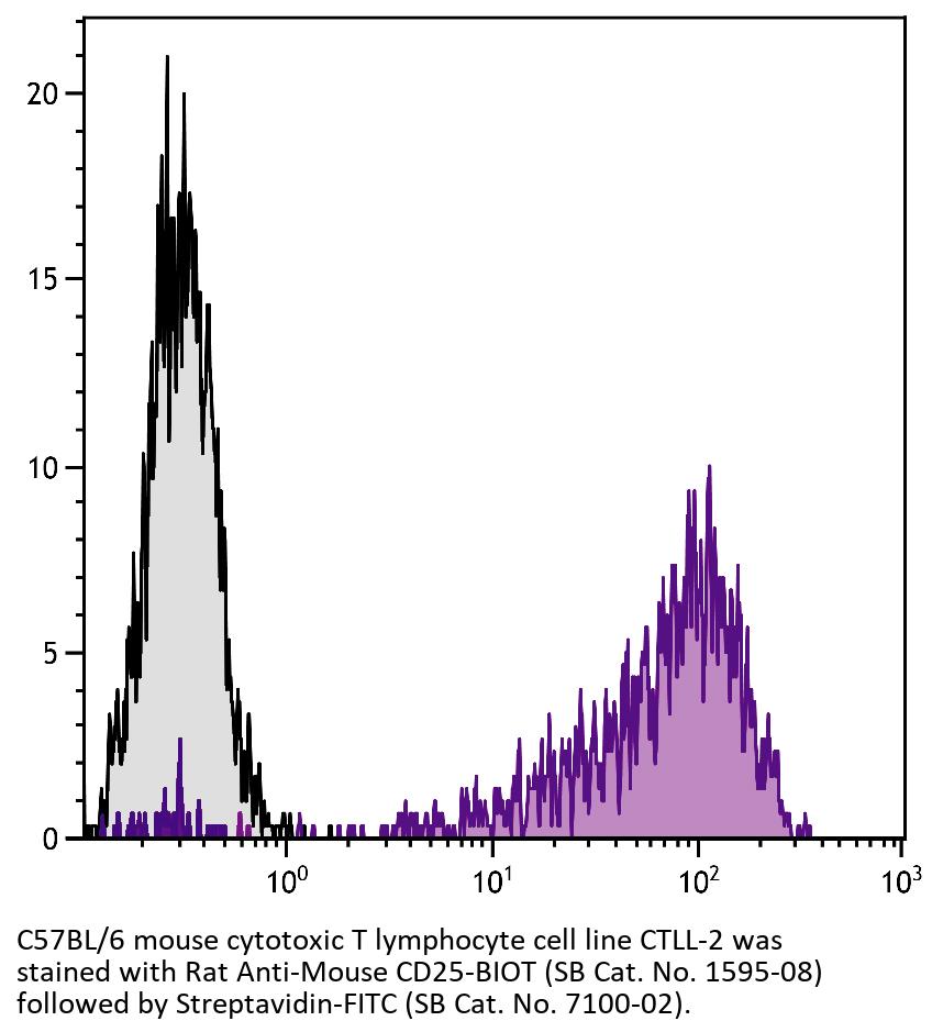 The IL-2 receptor (IL-2R) exists in three alternative forms made up from the individual components of CD25, CD122, and CD132. CD25 represents the low affinity α chain of the IL-2R, a type I transmembrane glycoprotein containing two CCP domains. It is rich in O-linked carbohydrates and has a short cytoplasmic tail. CD25 is expressed on activated T cells, B cells, NK cells, and monocytes of all mouse strains tested. It is transiently expressed at a low level during B cell development in bone marrow on the CD45R/B220low TdT- sIg- pre-B II and CD45R/B220low TdT- sIgM+sIgD- immature B cells, but not on the CD45R/B220low TdT+ sIg- pro-B/pre-B I stage nor on CD45R/B220high TdT- sIgM+sIgD+ mature B cells. CD25 is expressed at a higher level during very early T-cell development in fetal and adult thymus. The 7D4 monoclonal antibody reacts with an epitope between amino acids 125 and 212 that is distinct from that recognized by the monoclonal antibody 3C7 (SB Cat. No. 1600). While the monoclonal antibody 7D4 does not block the binding of IL-2 to CD25, when used in combination with the monoclonal antibody 3C7 it results in higher levels of inhibition of IL-2-driven proliferation than either of these two monoclonal antibodies alone.