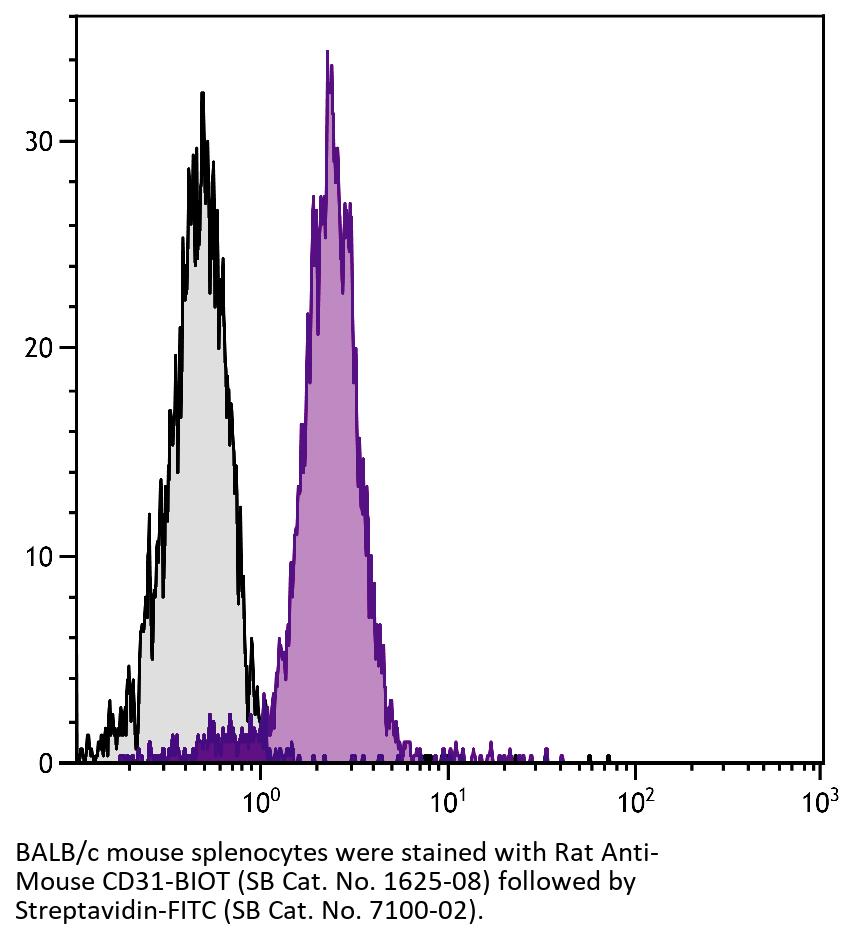 CD31, also known as platelet endothelial cell adhesion molecule-1 (PECAM-1), is a type I integral membrane glycoprotein and a member of the immunoglobulin superfamily of cell surface receptors. It is constitutively expressed on the surface of endothelial cells and concentrated at the junction between them. It is also weakly expressed on many peripheral lymphoid cells and platelets. CD31 interacts homotypically in cell adhesion assays. The monoclonal antibody 390 inhibits the aggregation of L cells transfected with a variant form of CD31.