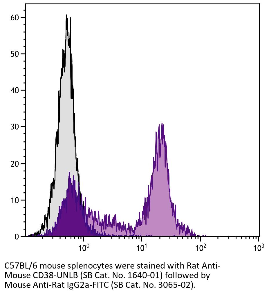 Murine CD38, a type II transmembrane glycoprotein, is a bifunctional ectoenzyme capable of catabolizing nicotinamide adenine dinucleotide (NAD+) to cyclic ADP-ribose (cADPR), and then hydrolyzing cADPR to adenosine diphosphoribose (ADPR). It is expressed at high levels on the surface of peripheral B-lineage cells and at low density on germinal center B cells from unimmunized mice. It has also been reported to be expressed at moderate levels on NK cells, a proportion of peripheral T cells, and a subpopulation of thymocytes which are mostly TCRαβ+, CD4-, CD8-. Murine CD38 is also expressed by all Mac-1+ macrophages in the peritoneal cavities of unimmunized mice but not by unstimulated bone-marrow-derived macrophages. Monoclonal antibodies to CD38 have been shown to induce B and T cell proliferation, protect B cells from apoptosis, and inhibit B lymphopoiesis.
