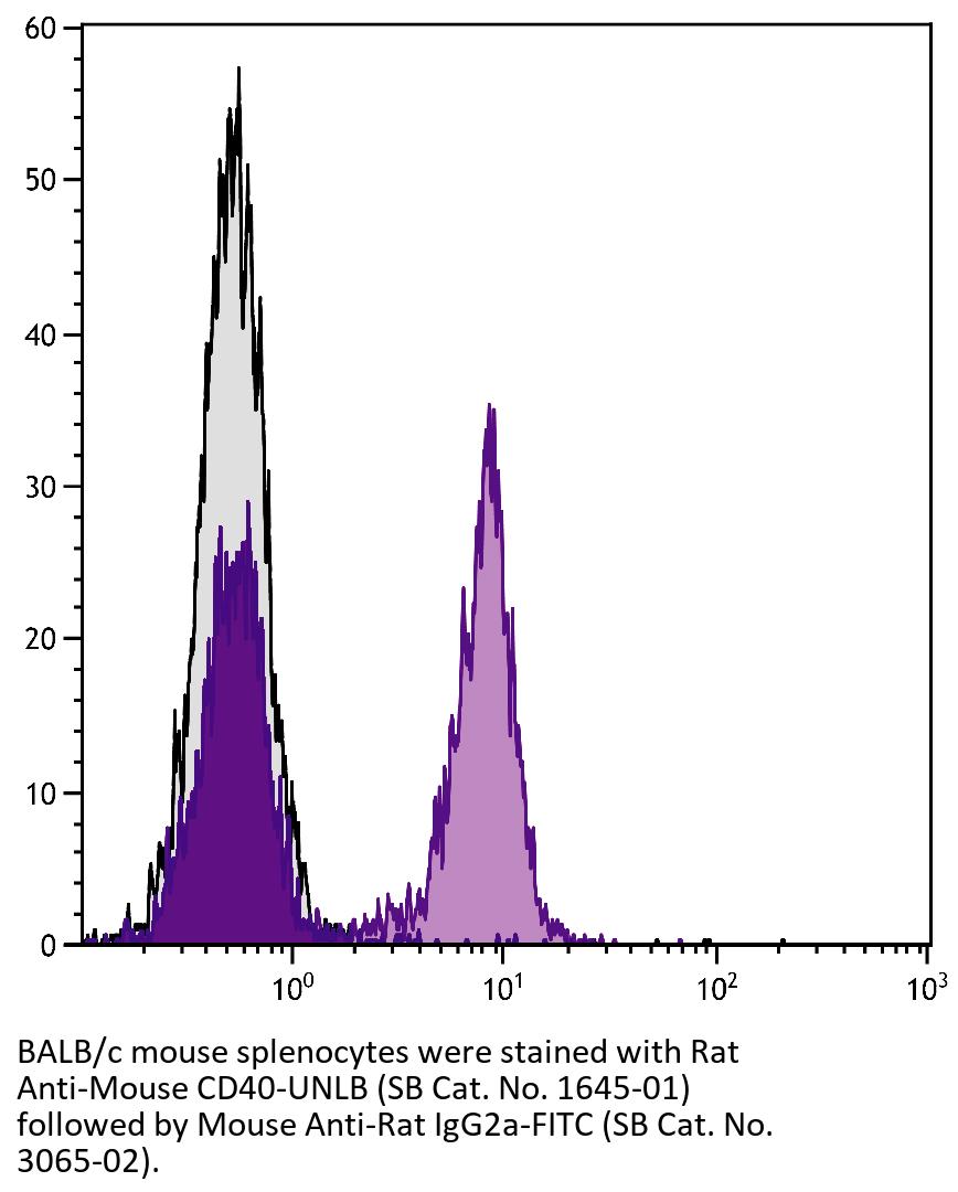 CD40 is a type I cell surface protein belonging to the tumor necrosis factor superfamily of cell surface receptors. In mice it is expressed on B lineage cells, follicular dendritic cells, thymic epithelium, and interdigitating cells in the T-cell zone of secondary lymphoid organs. CD40 first becomes detectable on a subset of small pre-B II cells in bone marrow with the levels of CD40 expression increasing thereafter during B cell maturation. Immature B cells (IgM+IgDloB220lo) express intermediate levels of CD40, whereas mature B cells (IgM+IgDhiB220hi) express high levels. CD40 has a central role in B cell growth and differentiation, and signaling through CD40 in combination with IL-4 reportedly induces immunoglobulin isotype switching and secretion of IgE. The agonistic 1C10 antibody closely resembles gp39/CD40 ligand in its ability to stimulate proliferation of small, resting B lymphocytes in the absence of other cofactors.