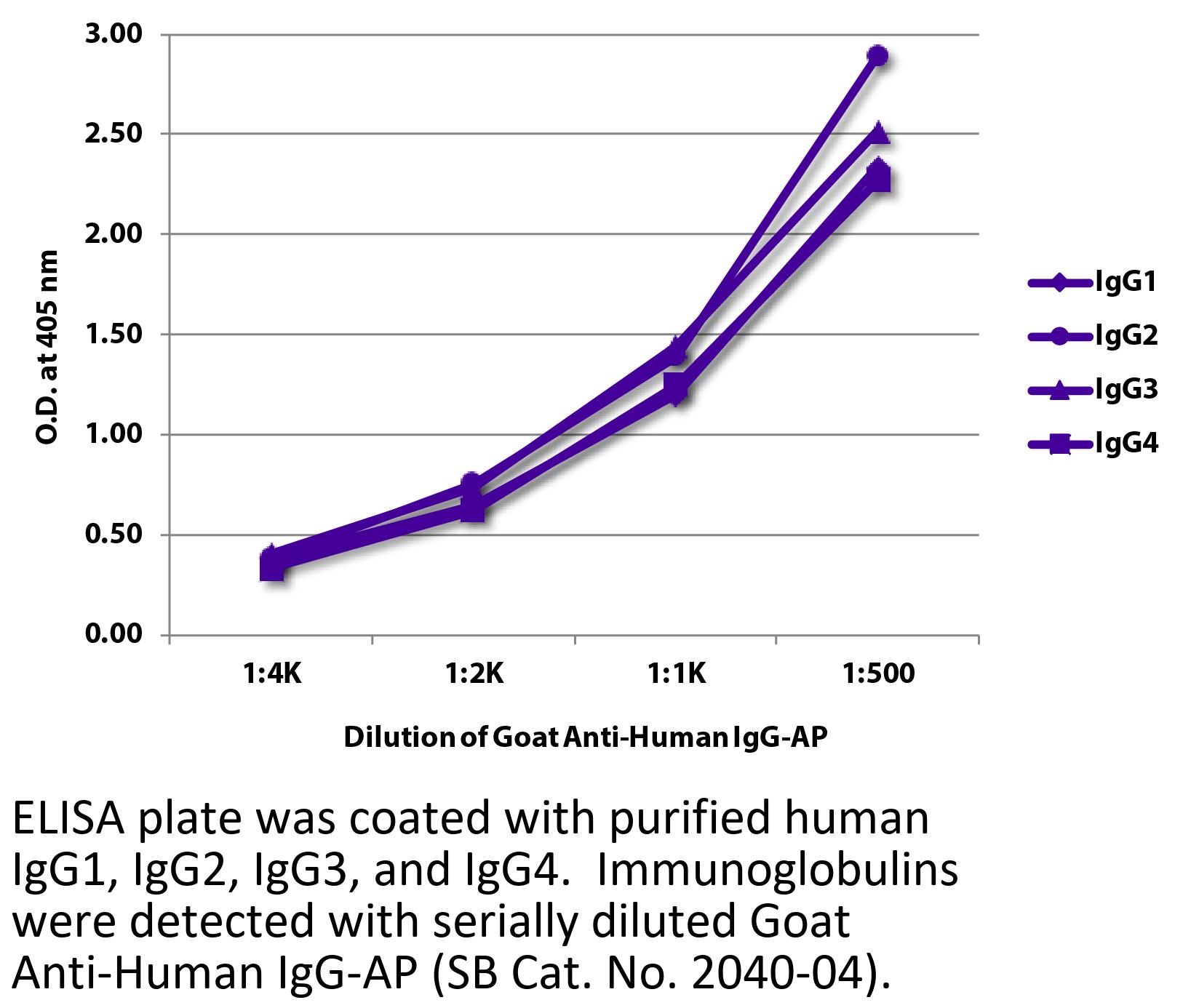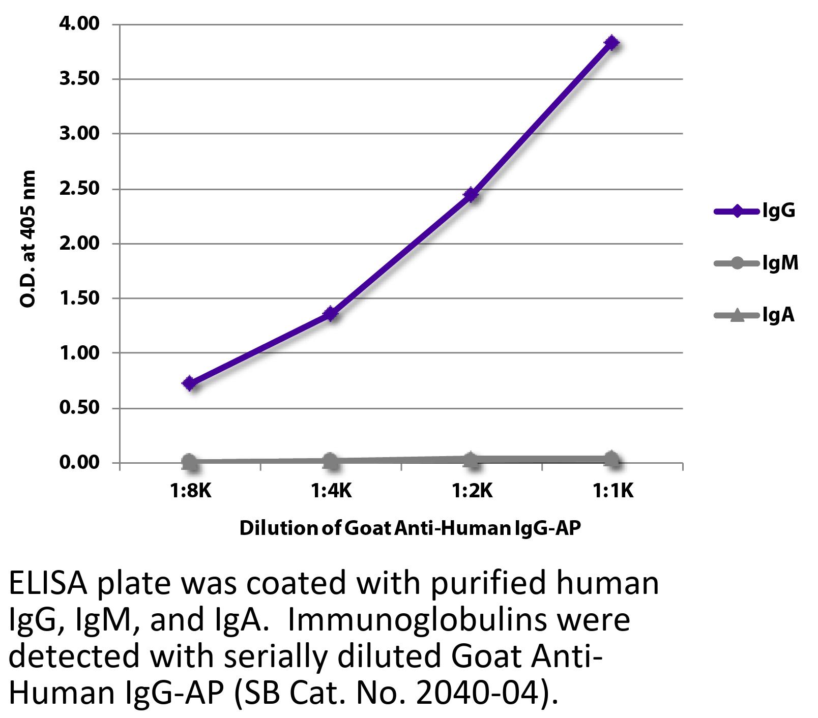 Goat Anti-Human IgG-AP antibody for use in ELISA, immunohistochemistry / immunocytochemistry, western blot, and ELISpot assays.