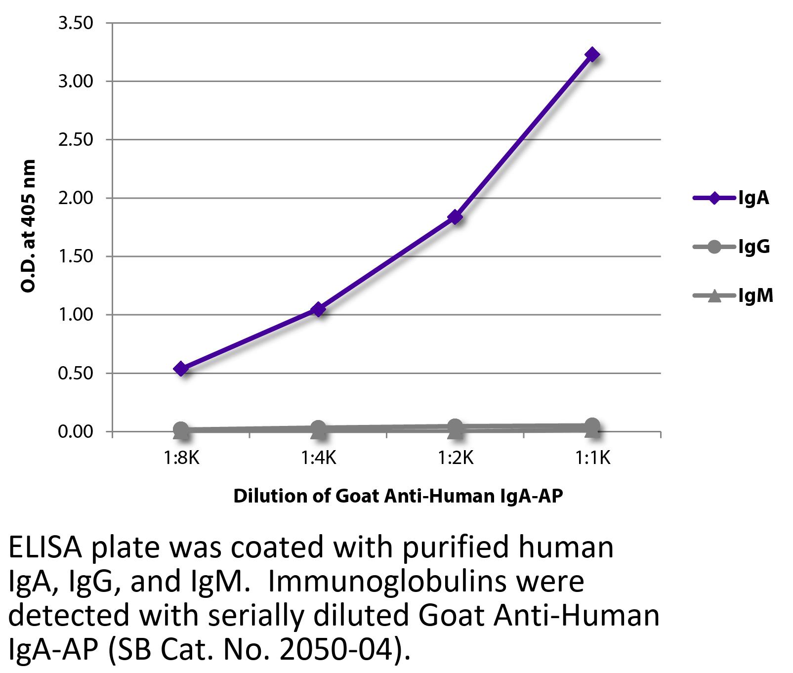 Goat Anti-Human IgA-AP antibody for use in ELISA, immunohistochemistry / immunocytochemistry, western blot, immunoprecipitation, and ELISpot assays.