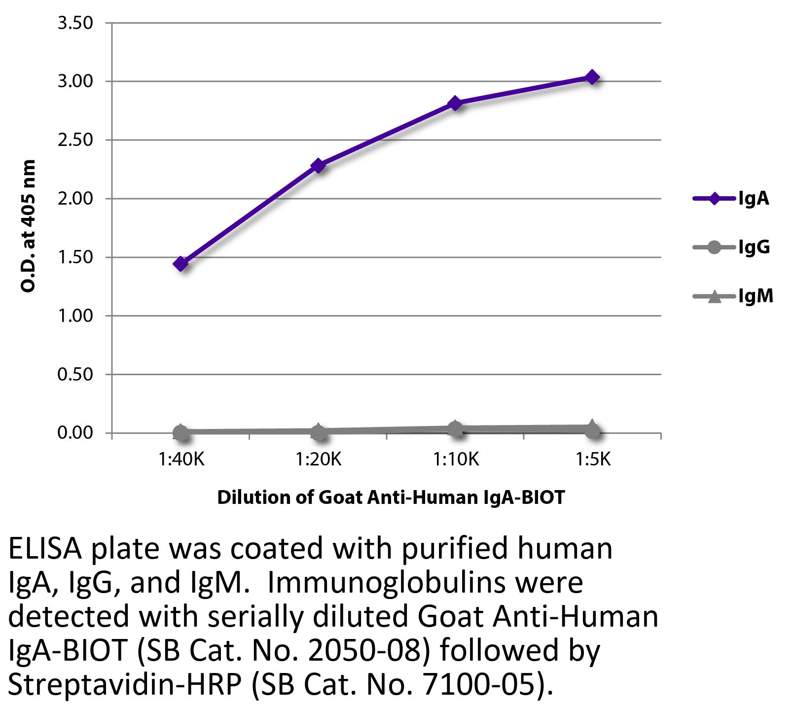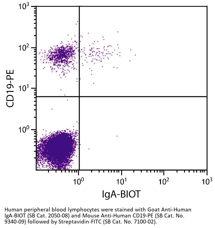 Goat Anti-Human IgA-Biotin antibody for use in ELISA, flow cytometry, immunohistochemistry / immunocytochemistry, western blot, immunoprecipitation, ELISpot, and multiplex assays.