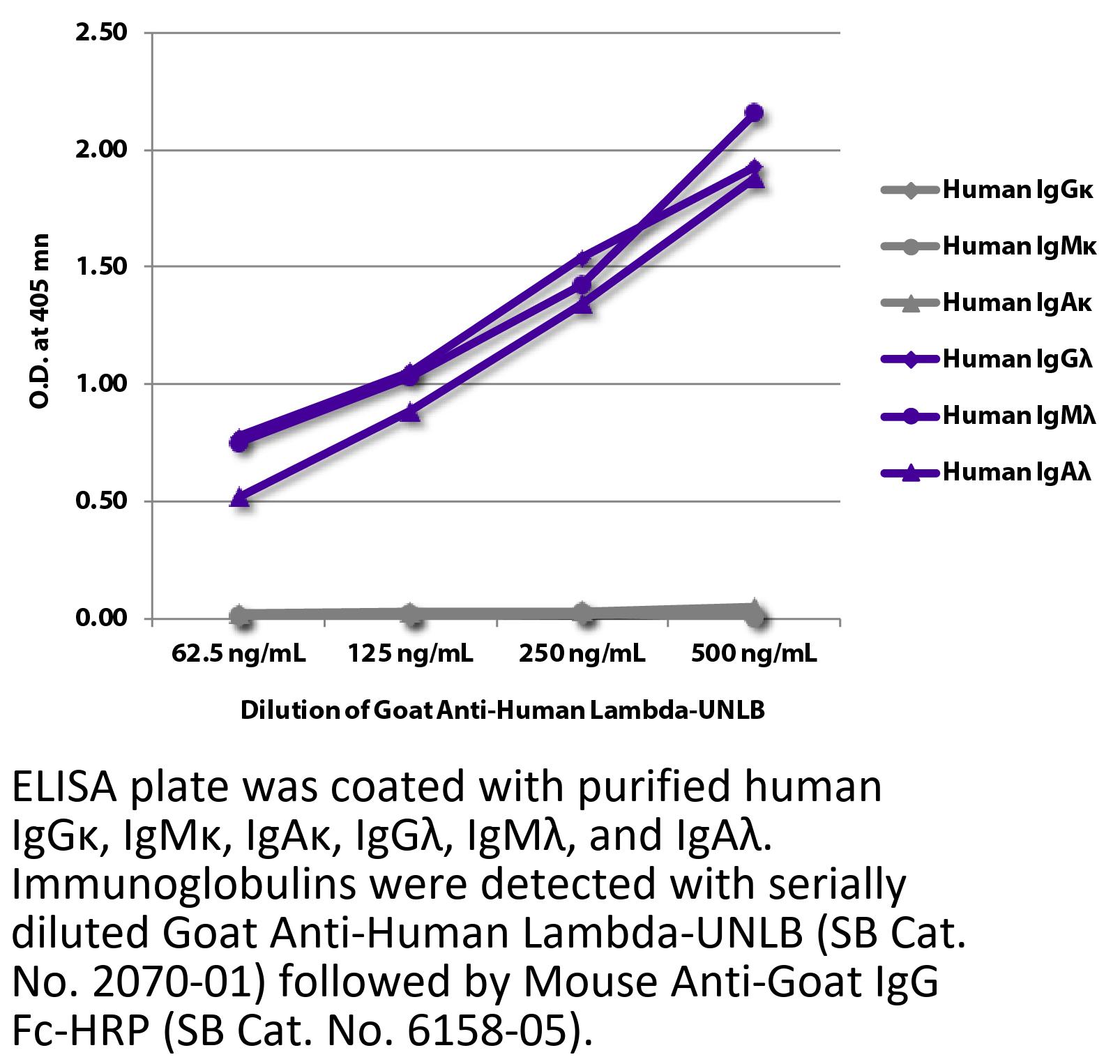 Purified Goat Anti-Human Lambda antibody for use in ELISA, flow cytometry, immunohistochemistry / immunocytochemistry, western blot, immunoprecipitation, ELISpot, and stimulation assays and for immobilization in surface plasmon resonance.