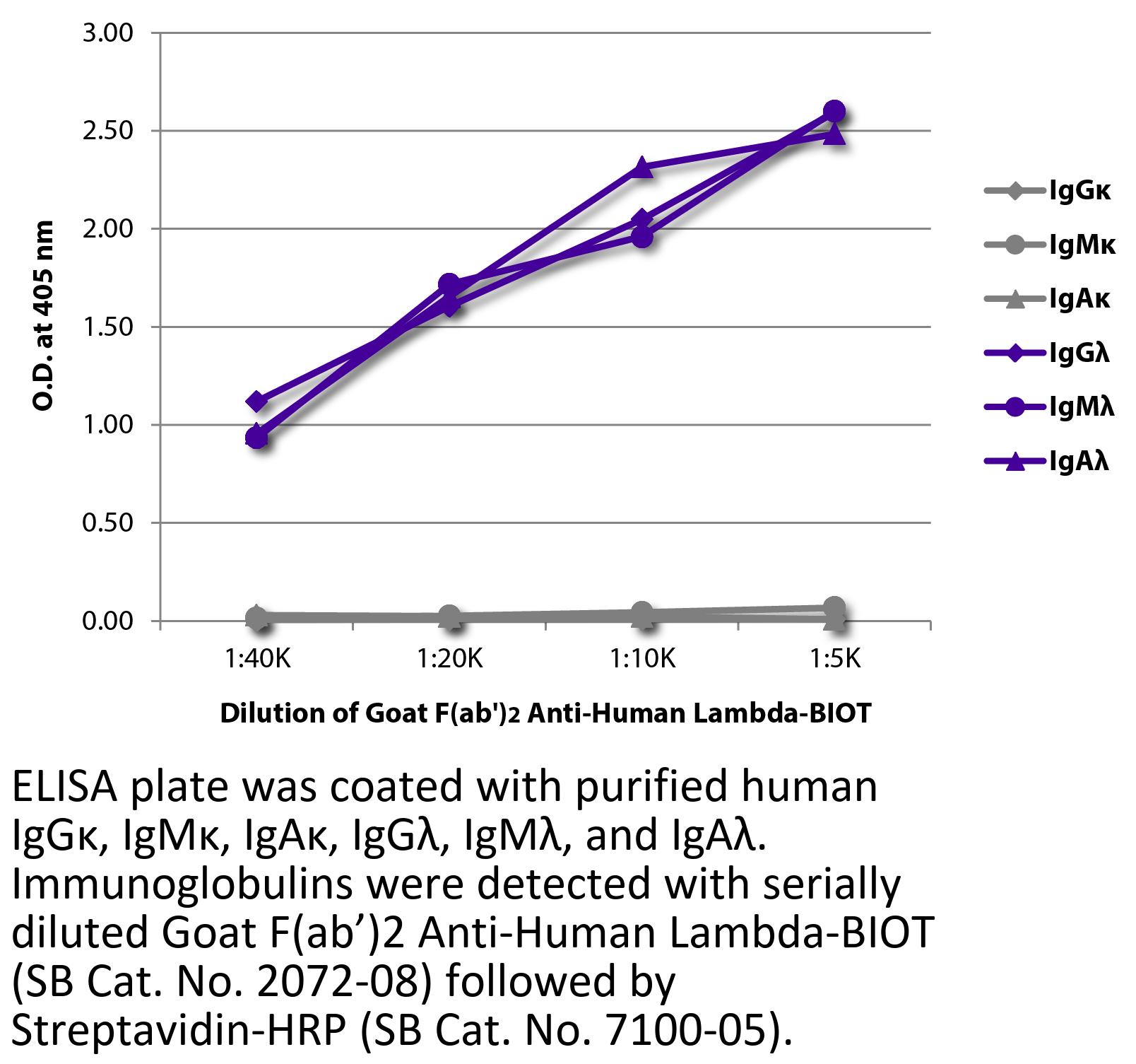 Goat F(ab')2 Anti-Human Lambda-Biotin antibody for use in ELISA, flow cytometry, and western blot assays.