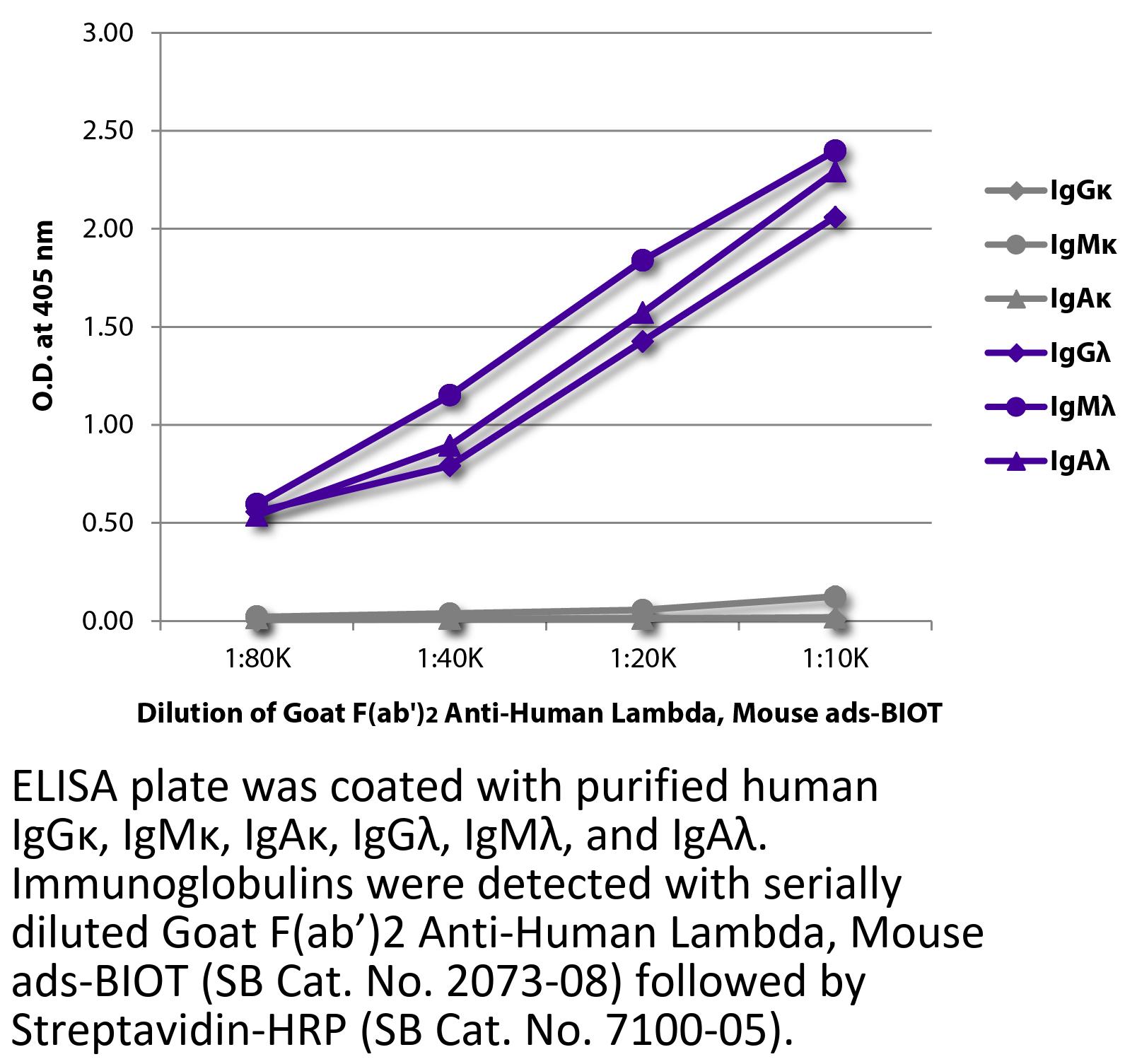 Goat F(ab')2 Anti-Human Lambda-Biotin antibody with minimal reactivity to mouse proteins for use in ELISA and flow cytometry assays.