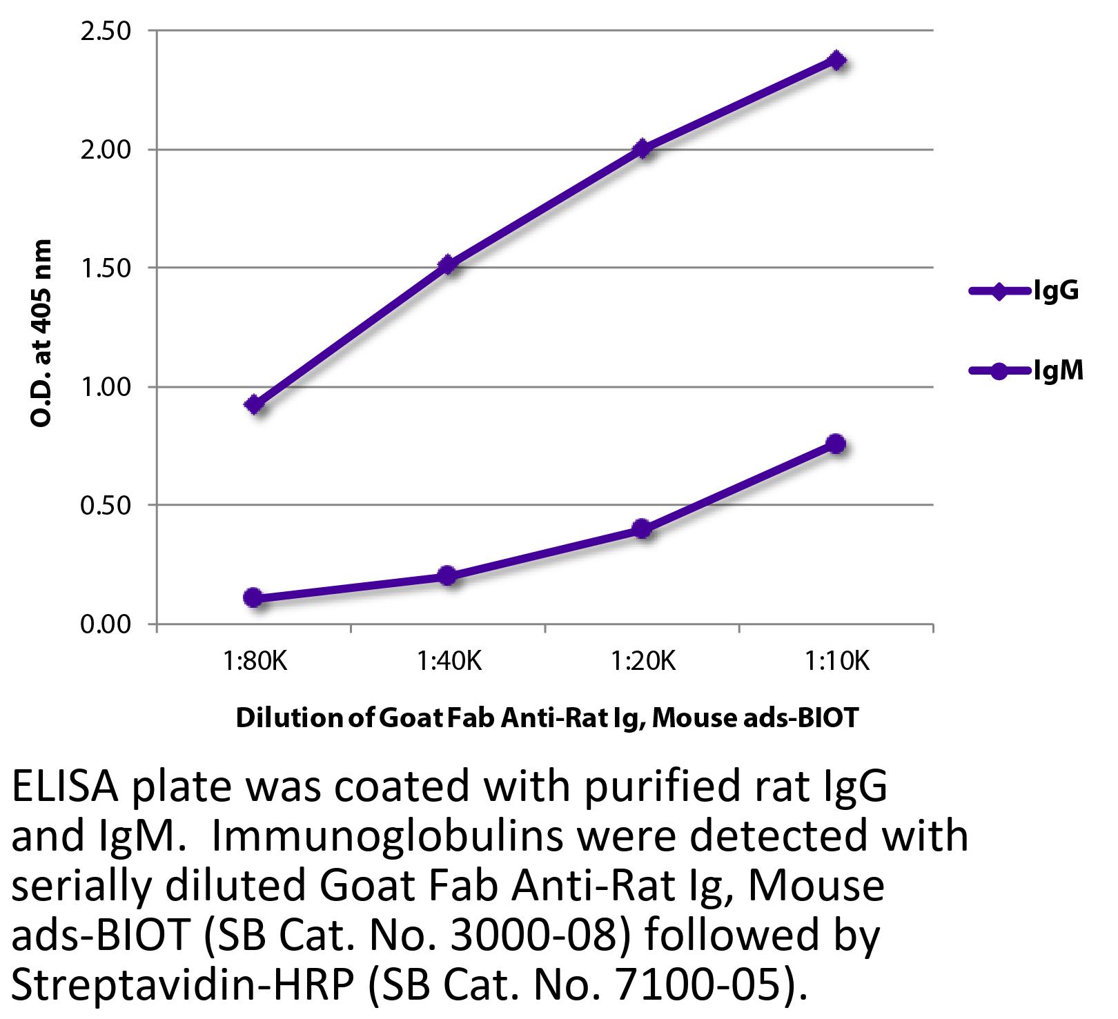 Goat Fab Anti-Rat Ig-Biotin antibody with minimal reactivity to mouse proteins for use in ELISA and flow cytometry assays.