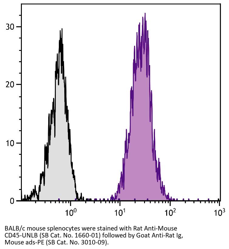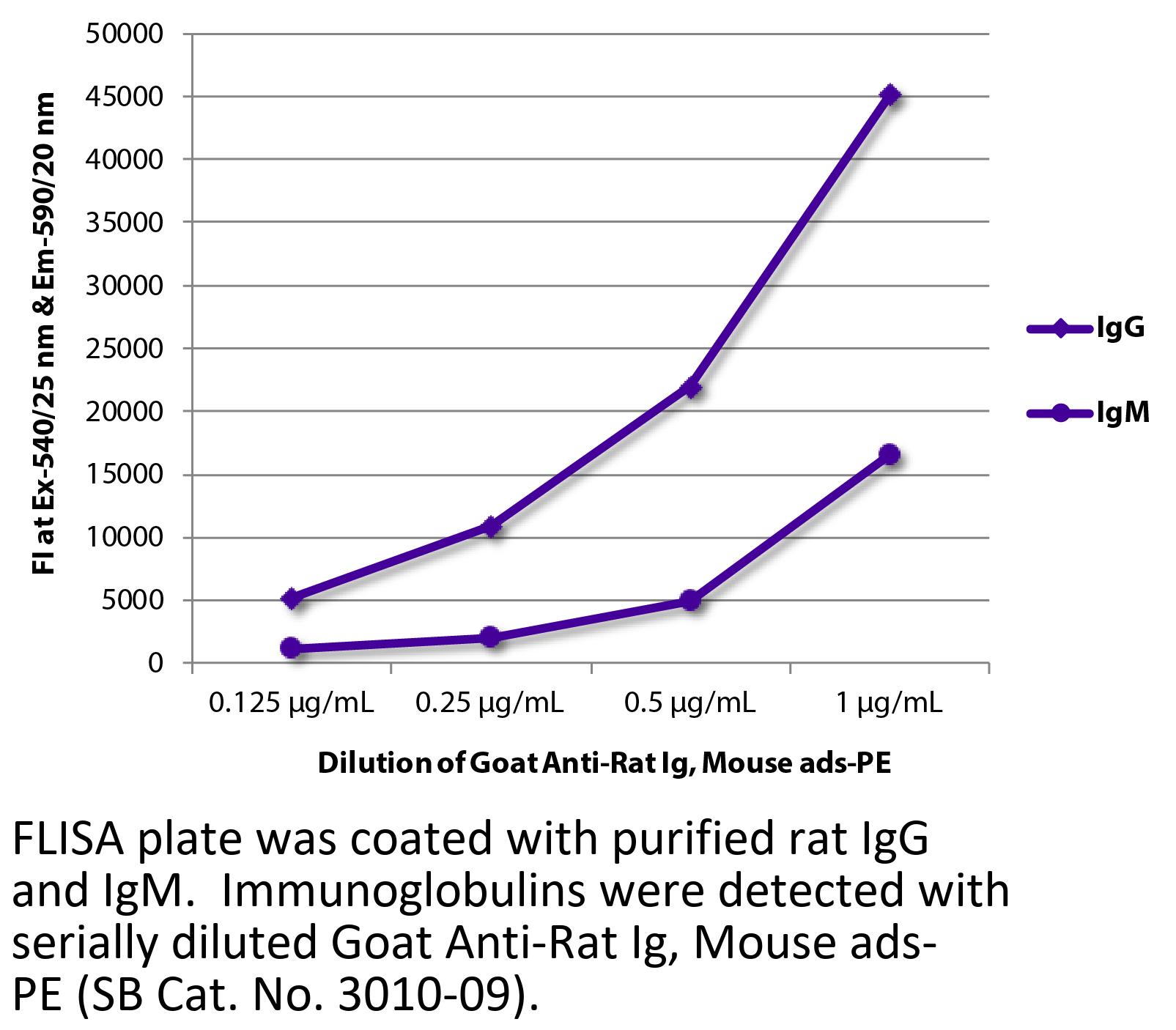 Goat Anti-Rat Ig-PE antibody with minimal reactivity to mouse proteins for use in flow cytometry assays.