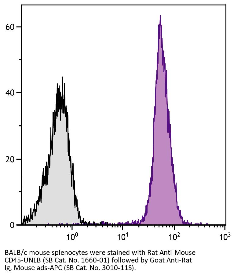 Goat Anti-Rat Ig-APC antibody with minimal reactivity to mouse proteins for use in flow cytometry assays.