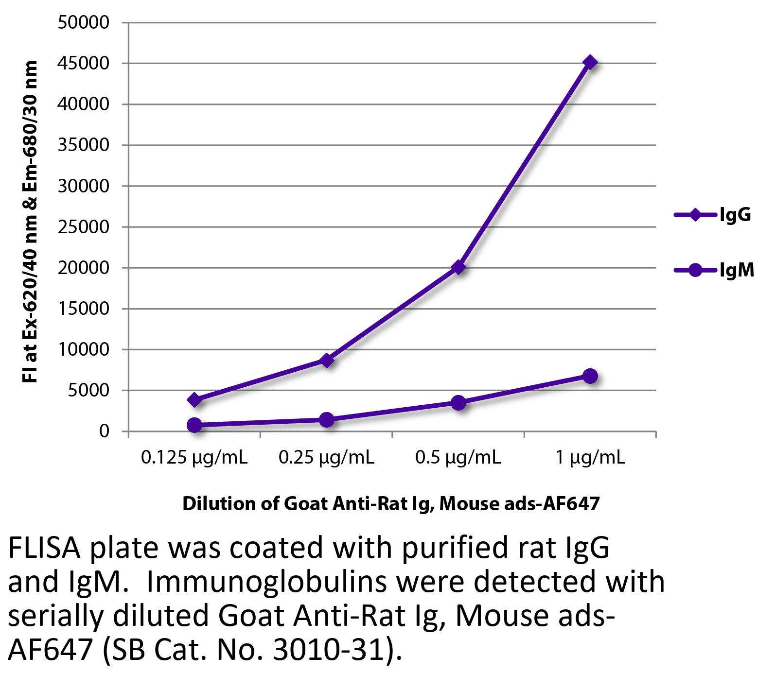 Goat Anti-Rat Ig-Alexa Fluor 647 antibody with minimal reactivity to mouse proteins for use in flow cytometry, immunohistochemistry / immunocytochemistry, and western blot assays.