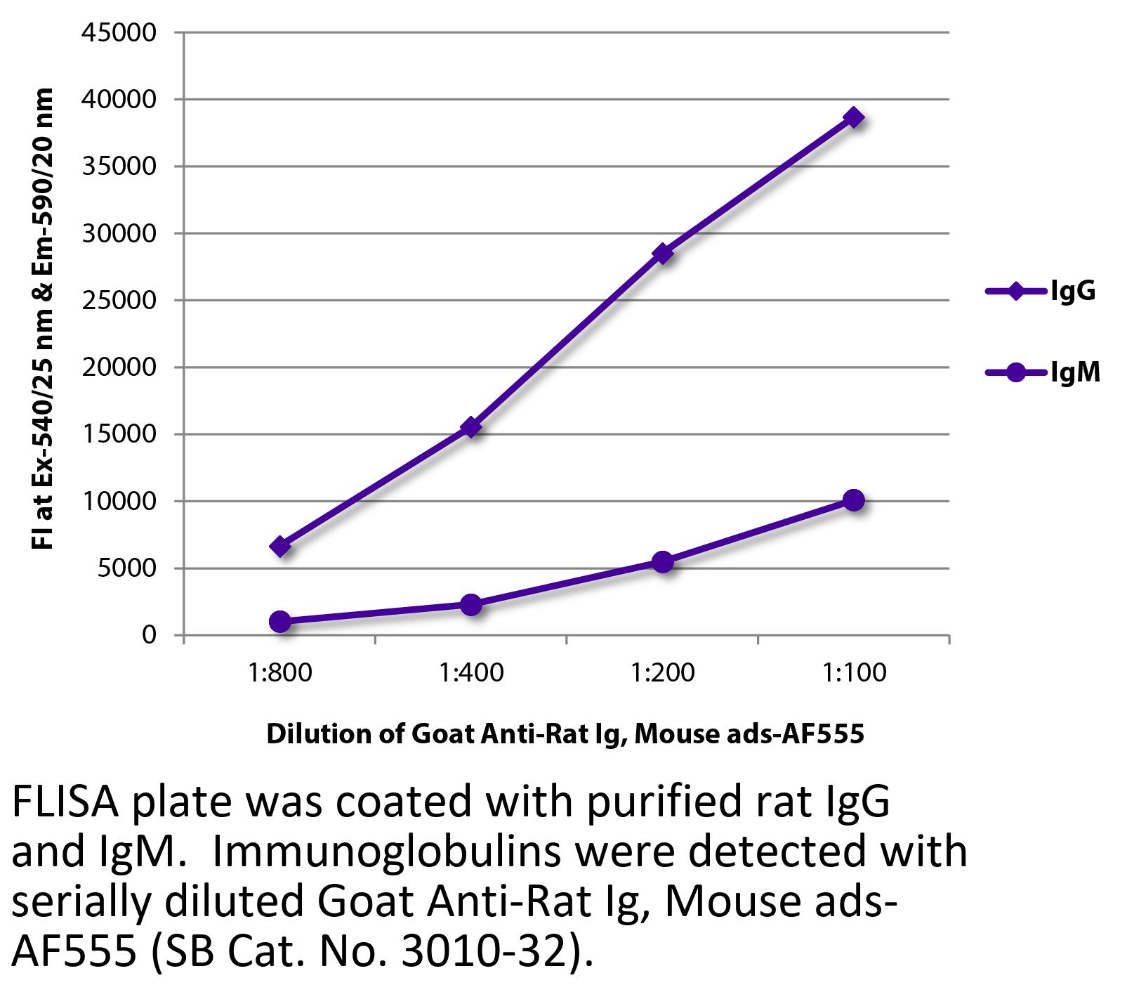 Goat Anti-Rat Ig-Alexa Fluor 555 antibody with minimal reactivity to mouse proteins for use in immunohistochemistry / immunocytochemistry and western blot assays.