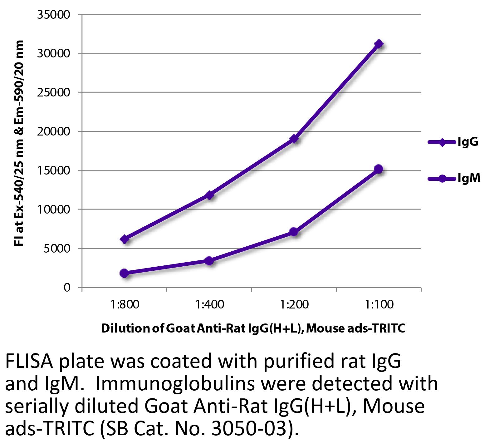 Goat Anti-Rat IgG(H+L)-TRITC antibody with minimal reactivity to mouse proteins for use in immunohistochemistry / immunocytochemistry assays.