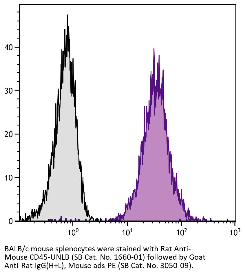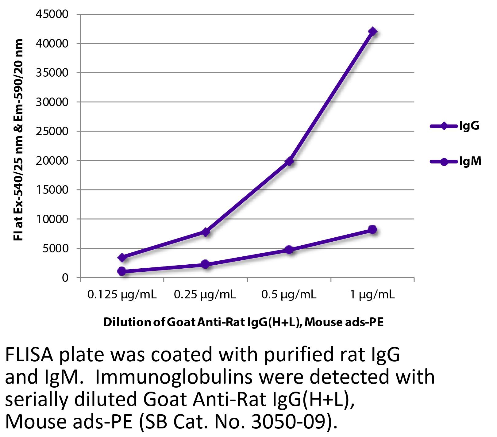 Goat Anti-Rat IgG(H+L)-PE antibody with minimal reactivity to mouse proteins for use in flow cytometry assays.