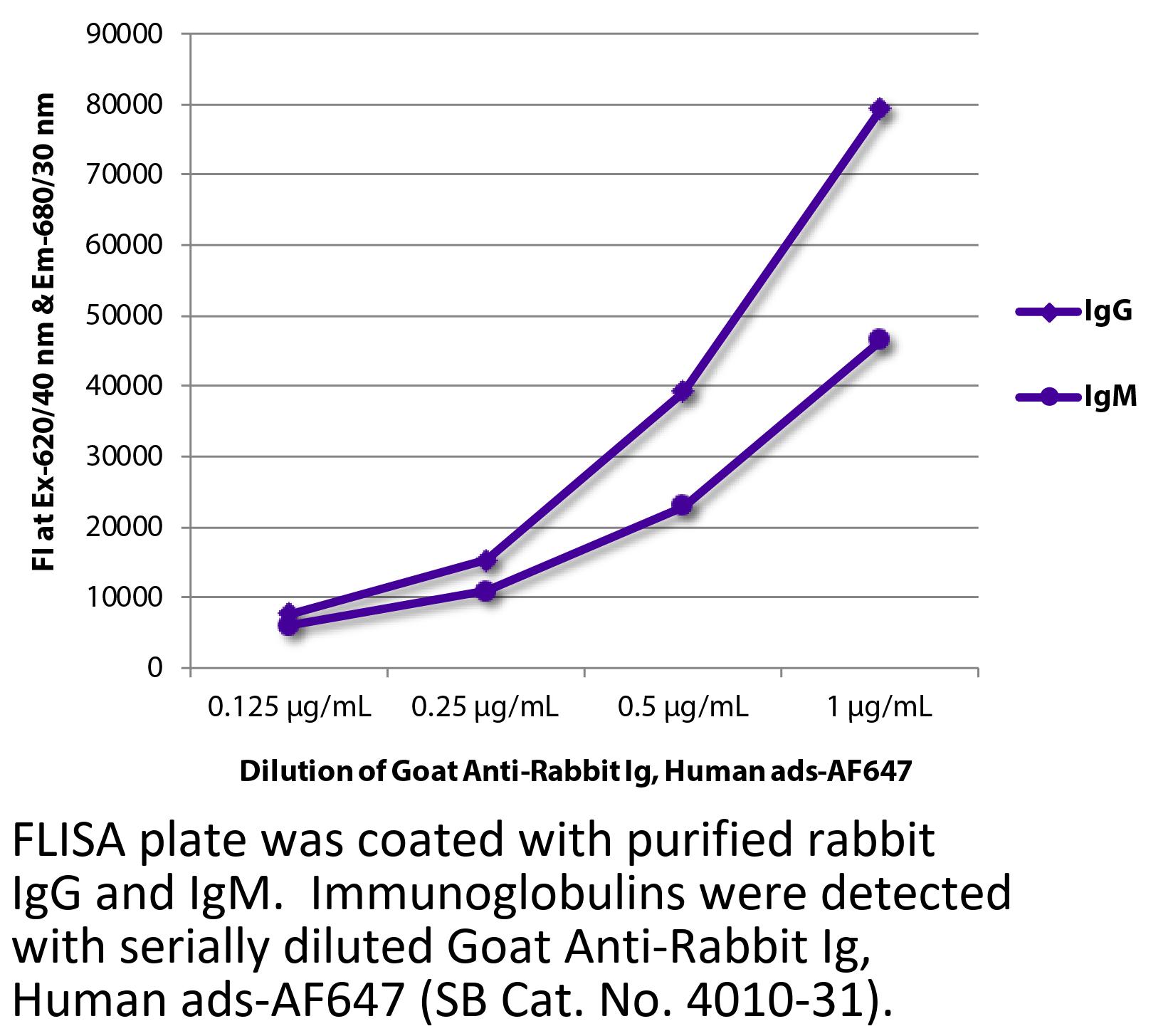 Goat Anti-Rabbit Ig-Alexa Fluor 647 antibody with minimal reactivity to human proteins for use in flow cytometry, immunohistochemistry / immunocytochemistry, and western blot assays.