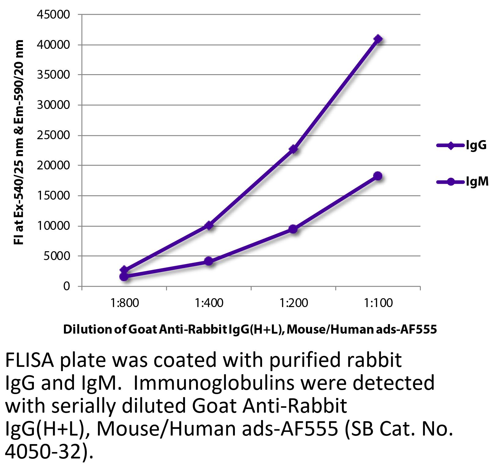 Goat Anti-Rabbit IgG(H+L)-Alexa Fluor 555 antibody with minimal reactivity to mouse and human proteins for use in immunohistochemistry / immunocytochemistry and western blot assays.