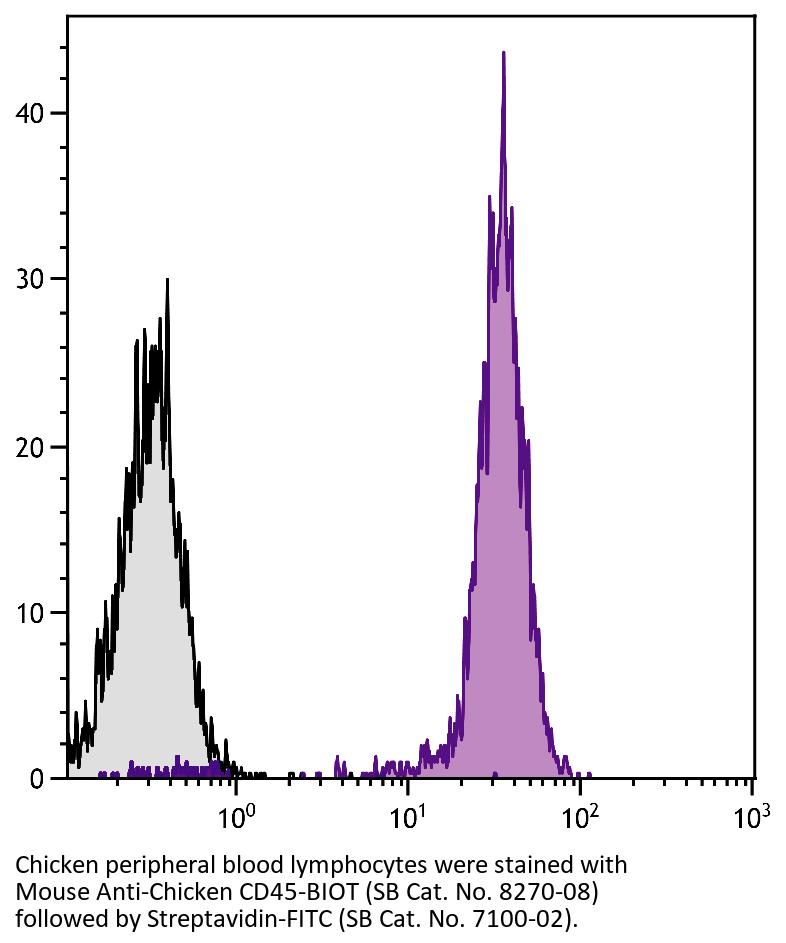 Chicken CD45 is a transmembrane glycoprotein expressed on all leukocytes. B lineage cells in the bursa of Fabricius express the 215 kDa isoform while T lineage cells bear the 190 kDa variant. These high molecular weight molecules have intrinsic phosphotyrosine phosphatase activity characteristic of mammalian CD45. Levels of CD45 expression detected by the monoclonal antibody LT40 in the avian thymus are heterogeneous with approximately 90% of thymocytes expressing fourfold higher levels of surface CD45 (CD45hi) than do the remaining 10% (CD45low) of thymocytes. The CD45low population contains exclusively thymocytes with the CD3-CD4-CD8low phenotype characteristic of the immediate precursors to the CD3-CD4+CD8+ thymic population which are CD45hi. This shift from low to high levels of surface CD45 expression is concomitant with the transition from CD4-CD8low to CD4+CD8+ and before the expression of CD3. The ability of the monoclonal antibody LT40 to discriminate this CD45low subpopulation provides a suitable marker for the CD3-CD4-CD8low immediate precursors to the CD3-CD4+CD8+ thymocytes.