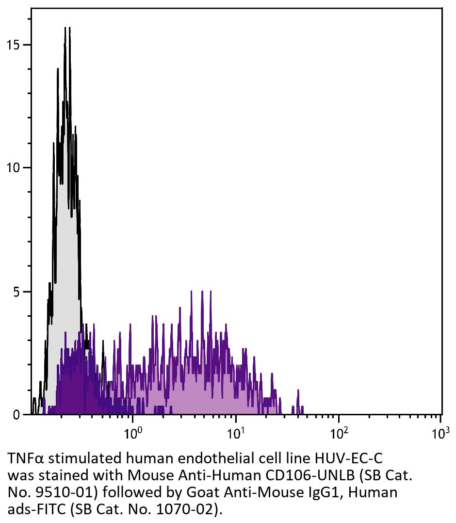 CD106, also known as INCAM-110, is a 110 kDa vascular adhesion cell adhesion molecule-1 (VCAM-1) that is member of the immunoglobulin superfamily. CD106 is expressed predominantly on cytokine-activated vascular endothelium but has also been identified on interfollicular dendritic cells, some macrophages, and bone marrow stromal cells. Endothelial CD106 binds the integrins α4β1 (CD49d/CD29, VLA-4) and α4β7 and contributes to extravasation of lymphocytes, monocytes, basophils, and eosinophils (but not neutrophils) from blood vessels, particularly at sites of inflammation. Unlike the β2 integrins, the CD106-VLA-4 interaction can mediate both the initial tethering and rolling of lymphocytes on endothelium as well as their subsequent arrest and firm adhesion. CD106 expressed on non-vascular tissues has been implicated in the interaction of hematopoietic progenitors with bone marrow stromal cells, B cell binding to follicular dendritic cells, costimulation of T cells, and embryonic development. The monoclonal antibody 1.G11B1 inhibits in vitro binding of lymphocytes and monocytes to VCAM-1 on stimulated endothelium.