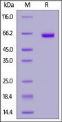 This protein carries a polyhistidine tag at the C-terminus. The protein has a calculated MW of 54.4 kDa. The protein migrates as 60-66 kDa when calibrated against Star Ribbon Pre-stained Protein Marker under reducing (R) condition (SDS-PAGE) due to glycosylation.