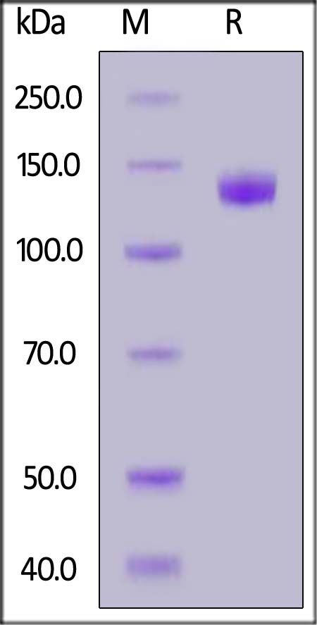This protein carries a human IgG1 Fc tag at the C-terminus. The protein has a calculated MW of 103.7 kDa. The protein migrates as 125-150 kDa under reducing (R) condition (SDS-PAGE) due to glycosylation.