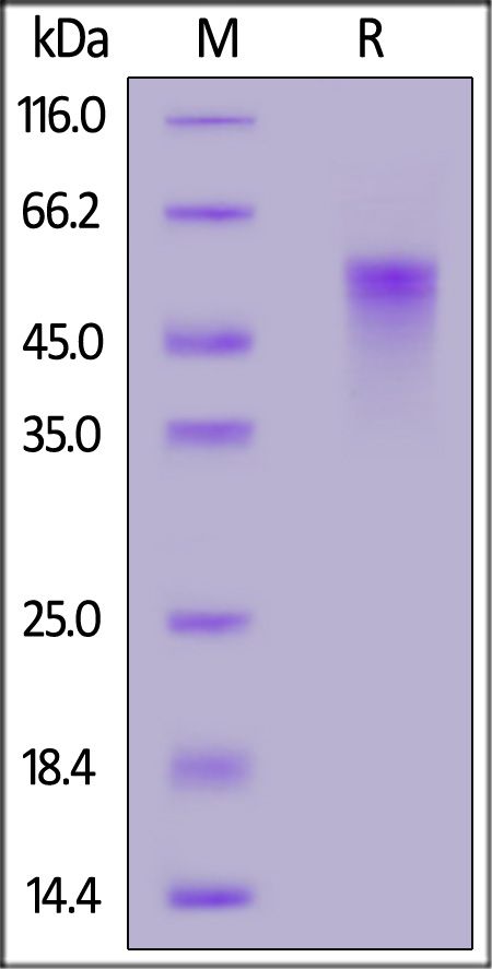 This protein carries a polyhistidine tag at the C-terminus. The protein has a calculated MW of 27.2 kDa. The protein migrates as 45-55 kDa under reducing (R) condition (SDS-PAGE) due to glycosylation.