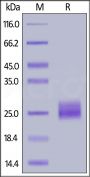 This protein carries no "tag". The protein has a calculated MW of 19.3 kDa. The protein migrates as 23-30 kDa under reducing (R) condition (SDS-PAGE) due to different glycosylation.