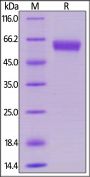 This protein carries a mouse IgG2a Fc tag at the C-terminus. The protein has a calculated MW of 44.2 kDa. The protein migrates as 55-65 kDa when calibrated against Star Ribbon Pre-stained Protein Marker under reducing (R) condition (SDS-PAGE) due to glycosylation.