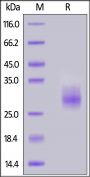 This protein carries a polyhistidine tag at the C-terminus. The protein has a calculated MW of 19.2 kDa. The protein migrates as 27-35 kDa when calibrated against Star Ribbon Pre-stained Protein Marker under reducing (R) condition (SDS-PAGE) due to glycosylation.