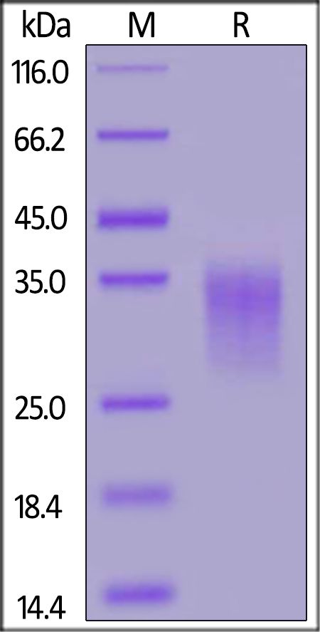 This protein carries a polyhistidine tag at the C-terminus. The protein has a calculated MW of 19.5 kDa. The protein migrates as 28-38 kDa under reducing (R) condition (SDS-PAGE) due to glycosylation.