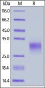 This protein carries a polyhistidine tag at the C-terminus. The protein has a calculated MW of 18.8 kDa. The protein migrates as 27-33 kDa under reducing (R) condition (SDS-PAGE) due to glycosylation.