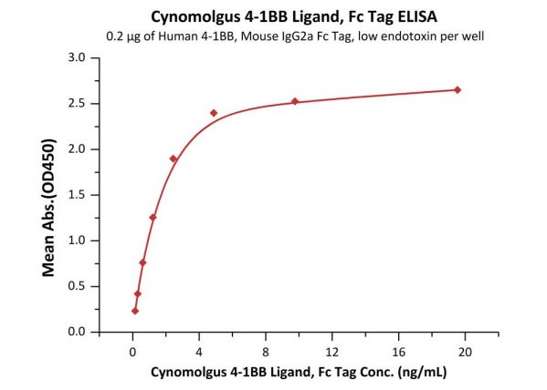 Cynomolgus 4-1BB Ligand, Fc Tag (41L-C5254) is expressed from human 293 cells (HEK293). It contains AA Leu 67 - Glu 251 (Accession # XP_015296398.1) trimer design.