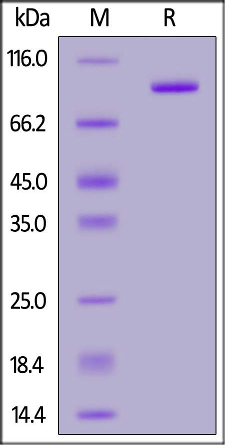 This protein carries a human IgG1 Fc tag at the N-terminus. The protein has a calculated MW of 87.4 kDa. The protein migrates as 90-100 kDa under reducing (R) condition (SDS-PAGE) due to glycosylation.