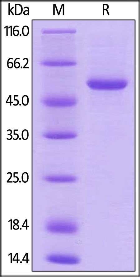 This protein carries a human IgG1 Fc tag at the C-terminus, followed by an Avi tag (Avitag™). The protein has a calculated MW of 50.2 kDa. The protein migrates as 50-55 kDa under reducing (R) condition (SDS-PAGE) due to glycosylation.