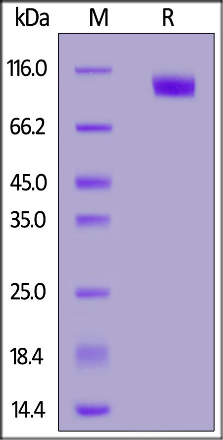 This protein carries a polyhistidine tag at the N-terminus, followed by a flag tag. The protein has a calculated MW of 72.3 kDa. The protein migrates as 95-115 kDa under reducing (R) condition (SDS-PAGE) due to glycosylation.