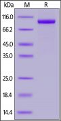 This protein carries a polyhistidine tag at the N-terminus. The protein has a calculated MW of 85.4 kDa. The protein migrates as 90-110 kDa under reducing (R) condition (SDS-PAGE) due to glycosylation.