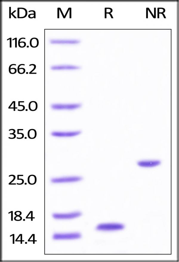 This protein carries no "tag". The protein has a calculated MW of 13.0 kDa. The protein migrates as 14-15 kDa under reducing (R) condition, and 23-25 kDa under non-reducing (NR) condition (SDS-PAGE) due to glycosylation.
