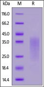 This protein carries a polyhistidine tag at the C-terminus. The protein has a calculated MW of 14.5 kDa. The protein migrates as 20-35 kDa when calibrated against Star Ribbon Pre-stained Protein Marker under reducing (R) condition (SDS-PAGE) due to glycosylation.