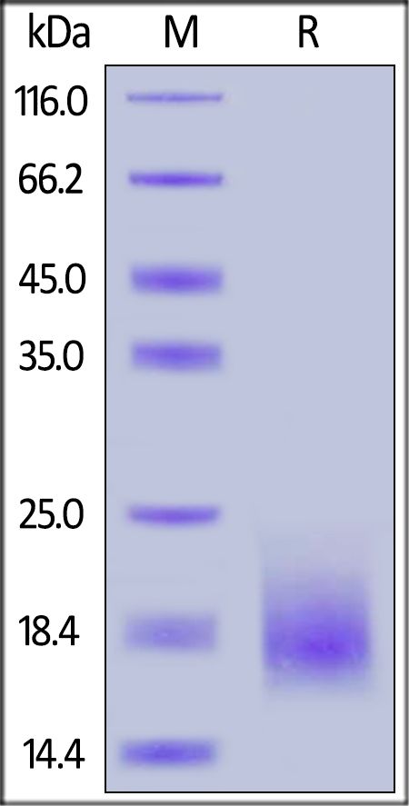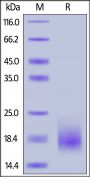 This protein carries a polyhistidine tag at the C-terminus. The protein has a calculated MW of 13.3 kDa. The protein migrates as 16-22 kDa under reducing (R) condition (SDS-PAGE) due to glycosylation.