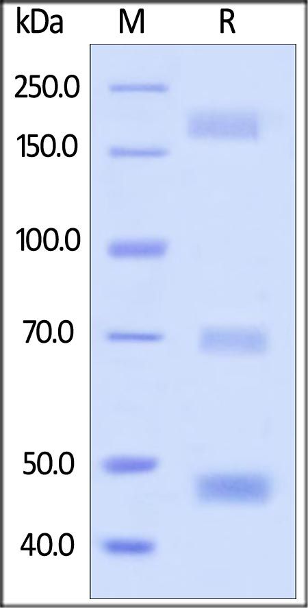 This protein carries a polyhistidine tag at the C-terminus. The protein has a calculated MW of 53.8 kDa. Two main fragments bands are visible with apparent MW of 57-65 kDa and 35-40 kDa respectively in reduced SDS-PAGE as a result of its being prone to proteolytic cleavage.