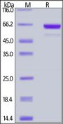 This protein carries a polyhistidine tag at the C-terminus, followed by a twin strep tag. The protein has a calculated MW of 59.5 kDa. The protein migrates as 60-66 kDa under reducing (R) condition (SDS-PAGE) due to glycosylation.