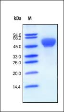 This protein carries a human IgG1 Fc tag at the C-terminus. The protein has a calculated MW of 40.3 kDa. The protein migrates as 56 kDa under reducing (R) condition (SDS-PAGE) due to glycosylation.
