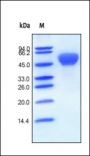 This protein carries a human IgG1 Fc tag at the C-terminus. The protein has a calculated MW of 40.3 kDa. The protein migrates as 56 kDa under reducing (R) condition (SDS-PAGE) due to glycosylation.