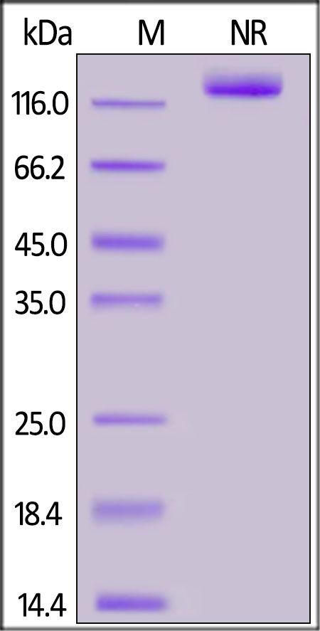 This protein carries a human IgG1 Fc tag at the N-terminus. The protein has a calculated MW of 76.7 kDa. The protein migrates as >170 kDa when calibrated against Star Ribbon Pre-stained Protein Marker under non-reducing (NR) condition (SDS-PAGE) due to glycosylation.