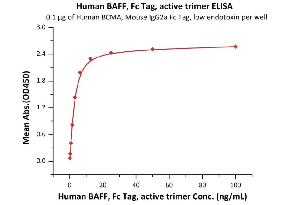 Human BAFF Protein, Fc Tag (BAF-H5261) is expressed from human 293 cells (HEK293). It contains AA Glu 140 - Leu 285 (Accession # Q9Y275-1) trimer Design.