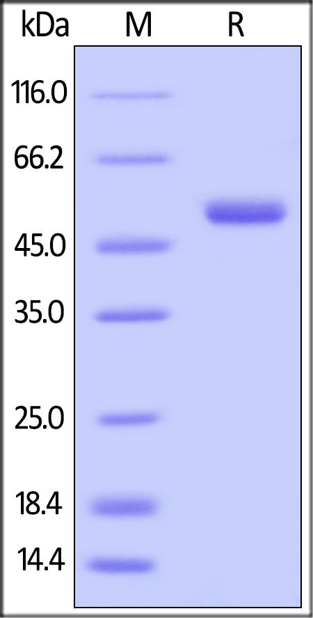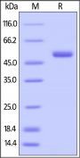 This protein carries an Avi tag (Avitag™) at the N-terminus, followed by a human IgG1 Fc tag. The protein has a calculated MW of 44.9 kDa. The protein migrates as 50-55 kDa when calibrated against Star Ribbon Pre-stained Protein Marker under reducing (R) condition (SDS-PAGE) due to glycosylation.