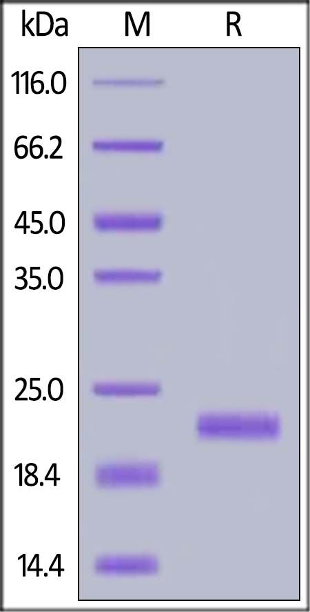 This protein carries a polyhistidine tag at the N-terminus, followed by an Avi tag (Avitag™). The protein has a calculated MW of 20.2 kDa. The protein migrates as 21-23 kDa when calibrated against Star Ribbon Pre-stained Protein Marker under reducing (R) condition (SDS-PAGE) due to glycosylation.