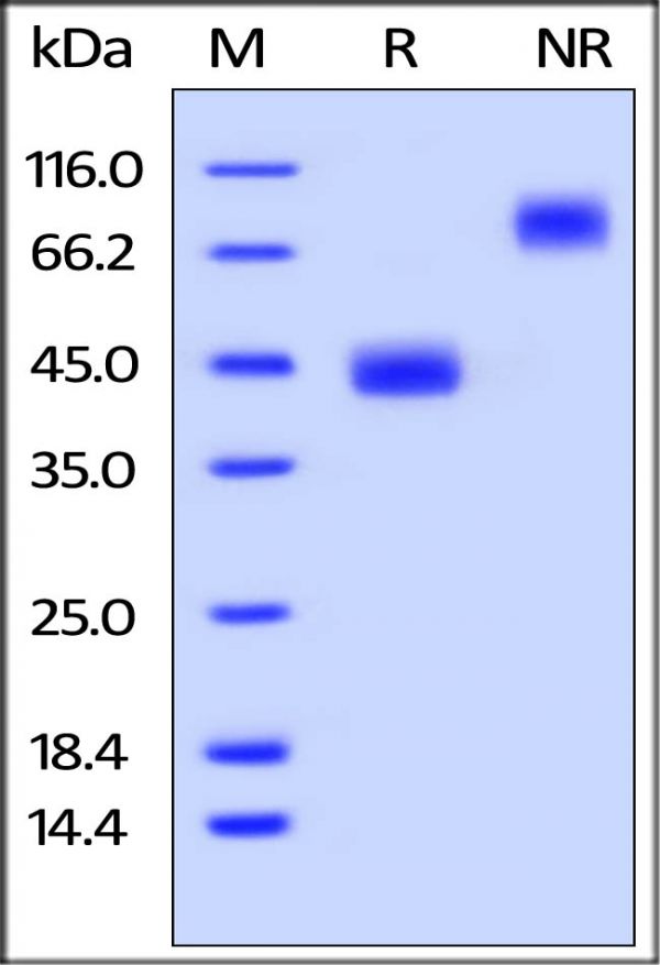 This protein carries a human IgG1 Fc tag at the C-terminus. The protein has a calculated MW of 33.3 kDa. The protein migrates as 40-45 kDa under reducing (R) condition, and 80-100 kDa under non-reducing (NR) condition (SDS-PAGE) due to glycosylation.