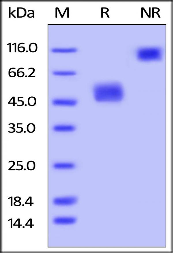 This protein carries a human IgG1 Fc tag at the C-terminus, followed by an Avi tag (Avitag™). The protein has a calculated MW of 35.1 kDa. The protein migrates as 45-60 kDa under reducing (R) condition, and 90-116 kDa under non-reducing (NR) condition (SDS-PAGE) due to glycosylation.