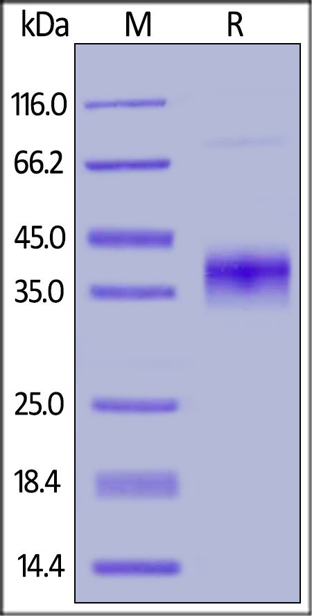 This protein carries a human IgG1 Fc tag at the C-terminus. The protein has a calculated MW of 32.0 kDa. The protein migrates as 35-45 kDa when calibrated against Star Ribbon Pre-stained Protein Marker under reducing (R) condition (SDS-PAGE) due to glycosylation.